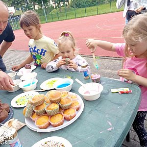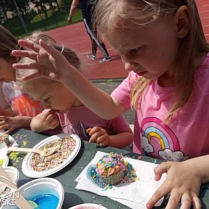 Dzieci mogły kolorować babeczki, które upiekły mamy. Najmłodsi mieli okazję kreatywnie malować na przeźroczystej folii, bądź rysować kredą.