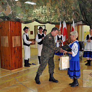 Po występie pani Maria Osmańska, w podziękowaniu za okazaną życzliwość, złożyła na ręce płk. Marka Gmurskiego wiązankę kwiatów w barwach narodowych. Dla upamiętnienia tego niecodziennego spotkania Komendant wręczył zespołowi ryngraf symbolizujmy tradycję CSWL Drawsko oraz zaprosił na żołnierski poczęstunek oraz do odwiedzenia Sali Tradycji.