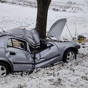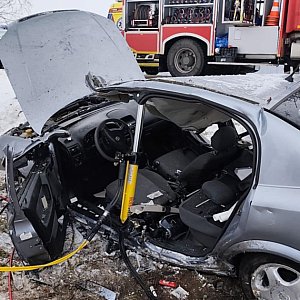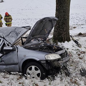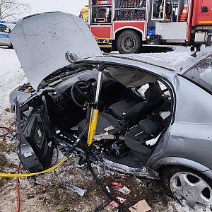 Pasażer był zakleszczony w aucie – by go wydobyć strażacy użyli narzędzi hydraulicznych. Mężczyzna został przetransportowany do szpitala przez Zespół Ratownictwa Medycznego.