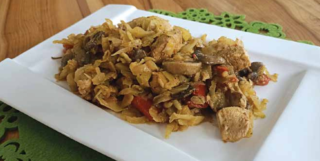 Dodać po krojoną w kostkę paprykę i piersi z kurczaka i dalej dusić pod przykryciem.